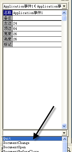 这个就是word对象中“Application”对象的所有触发事件,我们在选择“Application事件1”下来它的事件组合框选择“quit”事件